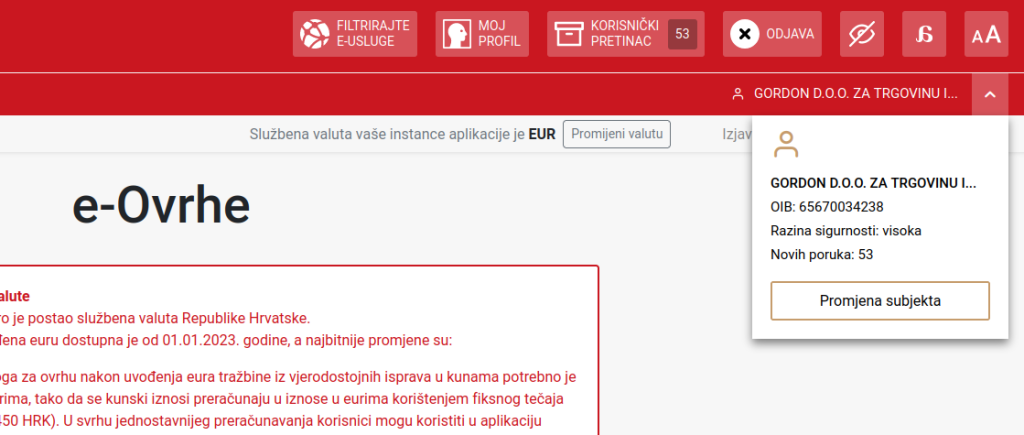 - Nakon zaprimanje obavijesti mailom o pozitivnom rješenju ali je sve u redu odrađeno možete najlakše provjeriti logiranjem u E-ovrhe. Nakon logiranja morate promijeniti subjekt na pravnu osobu. To možete napraviti gore desno na opciji “promjena subjekta”. Odaberite odvjetnički ured umjesto vas kao fizička osoba kao na slici: