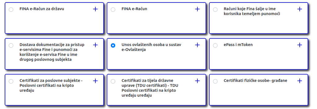 - Sljedeći korak je predati dokumente. To možete učiniti na linku ovdje (link). Treba izabrati opciju “Unos ovlaštenih osoba u sustav e-Ovlaštenja ” kao na slici (označeno plavim kružićem).