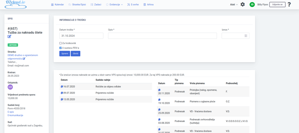 Izrada računa strankama s fizičkim spisom često zahtijeva pregled svih dokumenata u spisu i onda evidentiranje izvršenih radnji na osnovu papirnatih dokumenata. To može biti vrlo vremenski zahtjevno i mora se napraviti tako gdje je fizički spis. U o2cloudu se kod evidencije izvršenih radnji mogu vidjeti svi podnesci i ostali dokument iz e-komunikacije pa je kreiranje izvršenih radnje mnogo jednostavnije jer nema listanje fizičkih spisa.