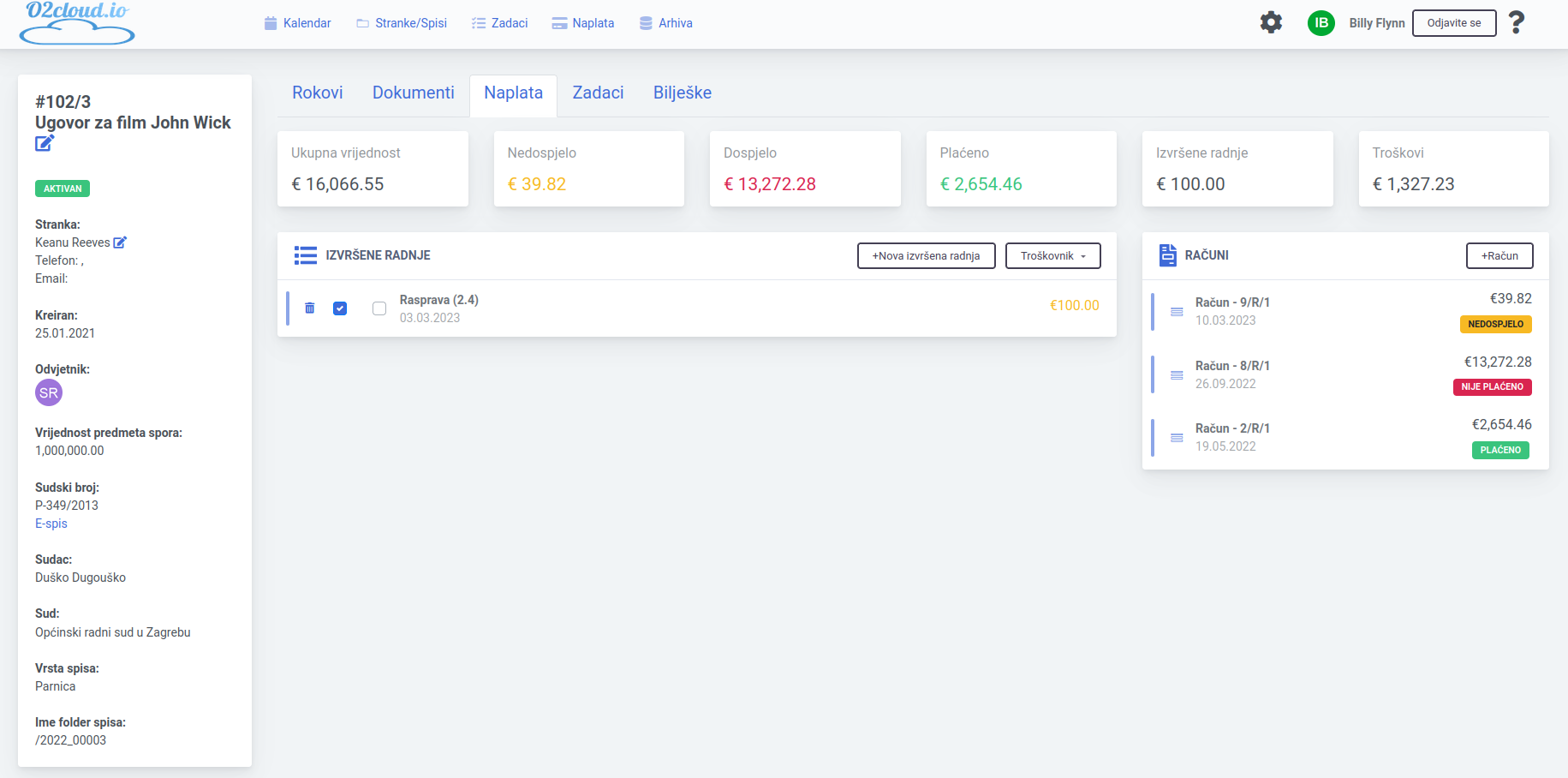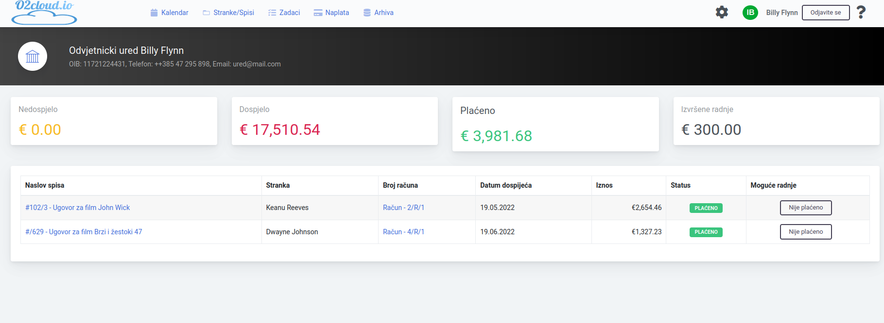 o2cloud može značajno smanjiti teret posla oko slanje računa strankama i evidencije plaćanje. Moguče je evidentirati izvršenu radnju na svakom spisu. Račun se može izraditi odmah nakon unosa izvršene radnje ili kasnije npr. na kraju mjeseca. Neki odvjetnici samu izradu računa nakon što su oni unijeli izvršene radnje onda delegiraju drugoj osobi i tako dodatno rasteretiti odvjetnika.