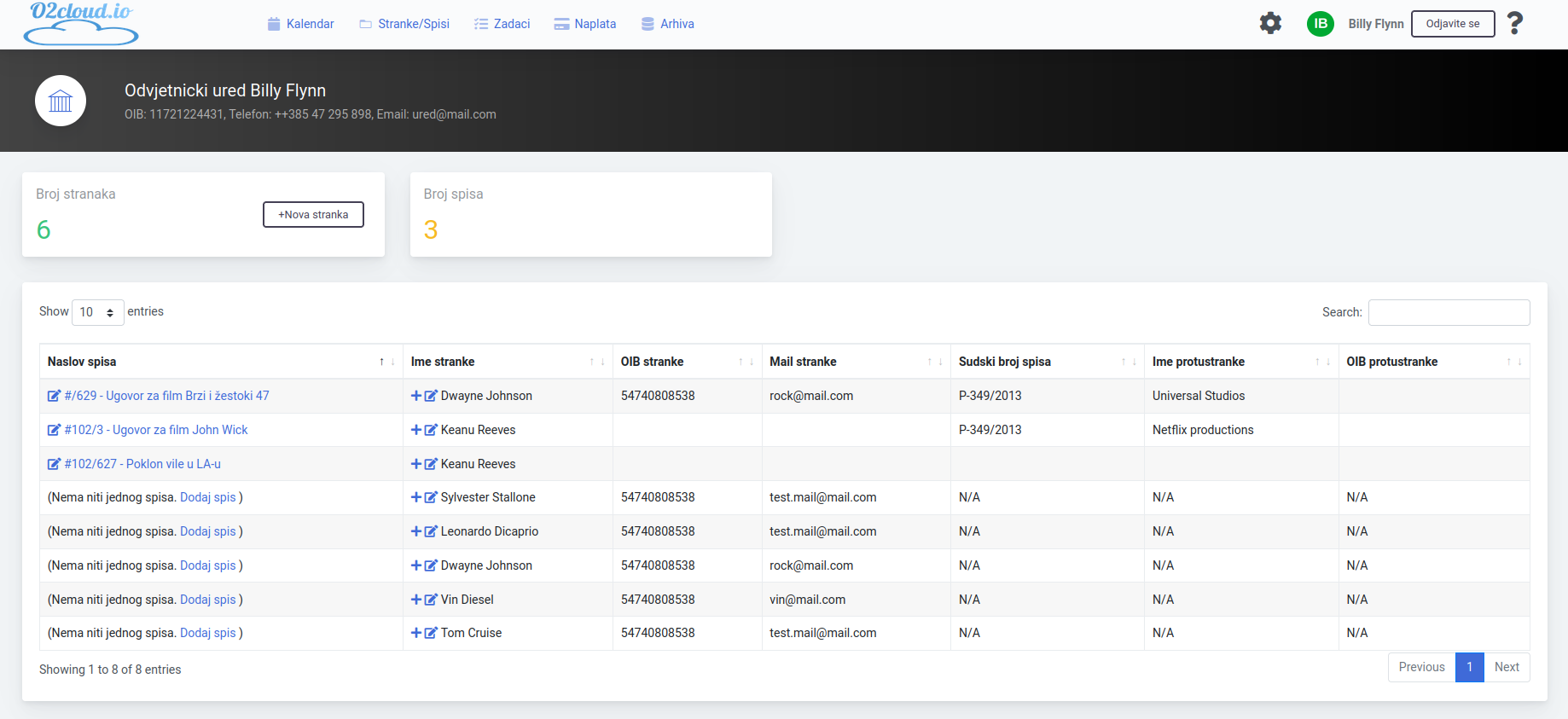 Svi spisi i klijenti su nalaze u jednoj evidenciji koja je jednostavno pretraživa. Dodavanje novih spisa na postojeće stranke ili dodavanje potpuno novih stranaka i spisa je jednostavno kao i izmjene podataka po postojećim. Tako unesene informacije se onda mogu kasnije koristiti bez potreba da se otvaraju fizičke spisi. Naravno, pretraživanje pa svim podacima se podrazumijeva.