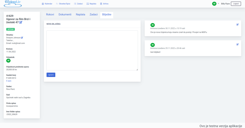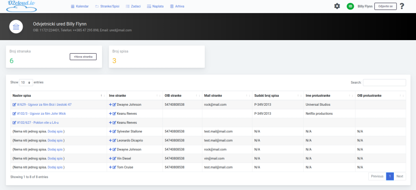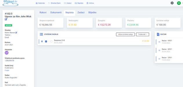 Isprobajte besplatno Kontaktirajte nas za više informacijao2cloud je all-in-one program za vođenje odvjetničkog ureda koji vam omogućuje da zaboravite duge prepiske e-mailom, nepotpune Excel tablice, stare post-it papiriće i traženje cut&paste grešaka u prepravljenim Word dokumentima te nalaženje istih baš u trenutku kad ste već isprintali dokument.