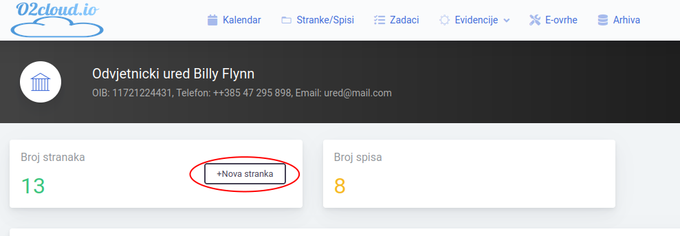 Za otvaranje nove stranke potrebno je kliknuti opciju Stranke/Spis na vrhu ekrana. Nakon toga