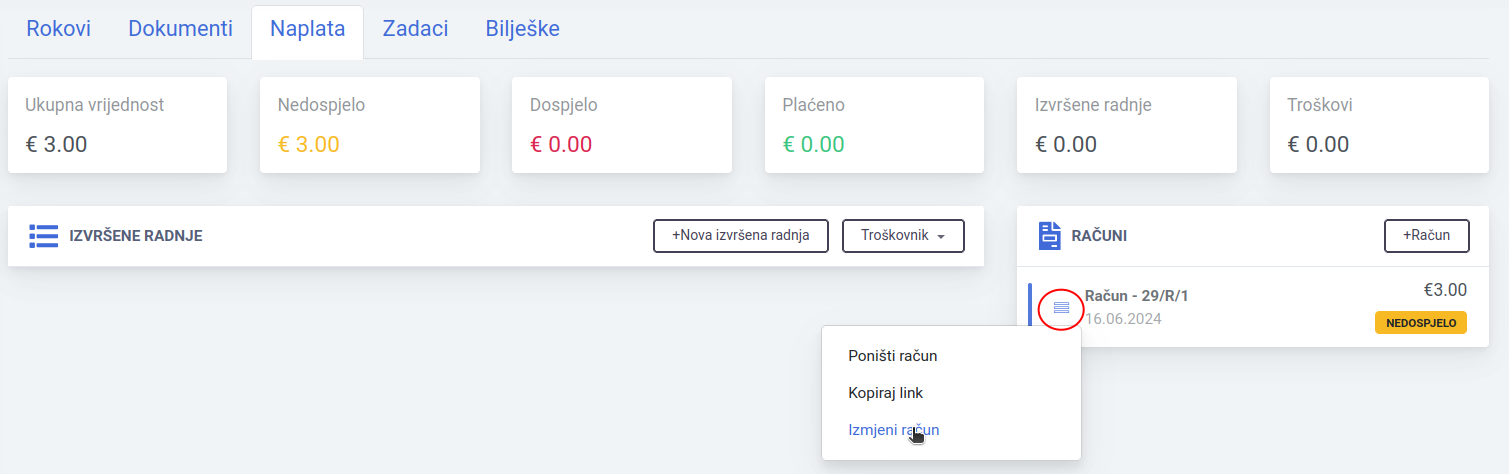 Za tu radnju je nakon toga moguće napraviti račun za stranku i poslati ga naplatu kao i za bilo koji drugi račun. Osim toga moguće je dodati i druge radnje ručnim unosom ako je potrebno ili ju jednostavno obrisati.