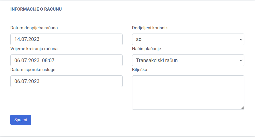 - promijeniti - ovim se otvara dialog gdje je moguće izmijeniti datume računa kao i unijeti bilješku koja će biti vidljiva na dnu računa.