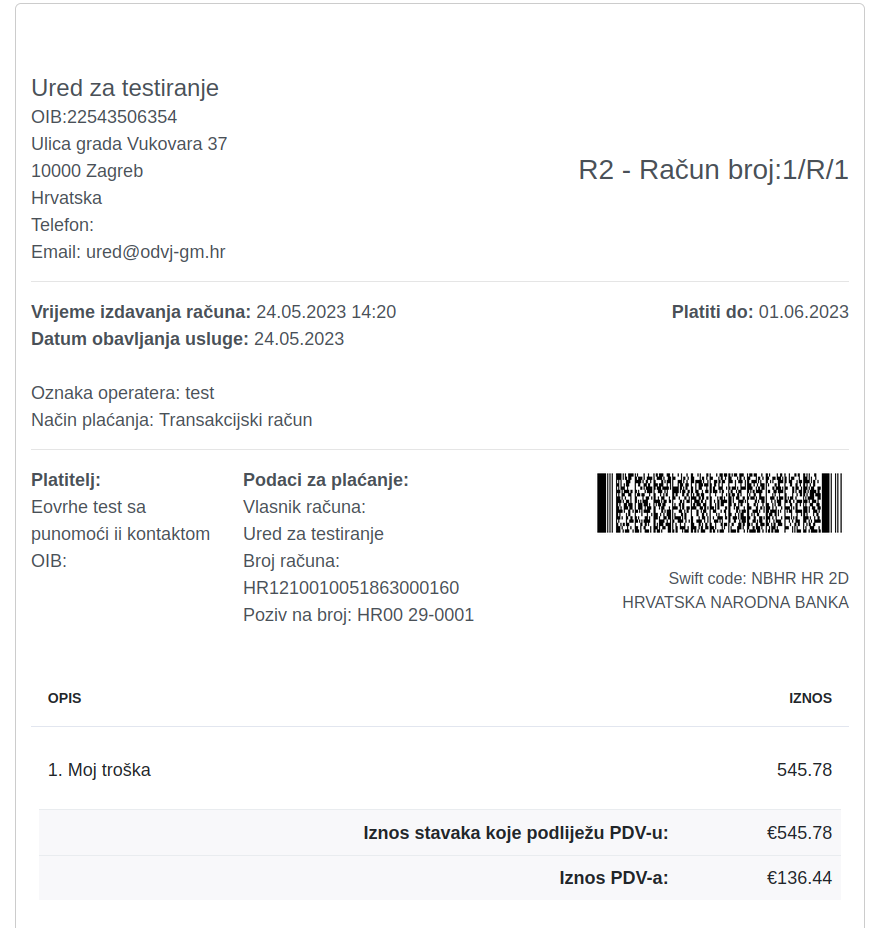 Ako je unesen IBAN u postavkama ureda račun će imati 2d bar kod što omogućava da ga stranka jednostavno i brzo plaća. Poziv na broj je jedinstven pa je jednostavnije utvrditi da li vam je račun već plaćen ili ne.