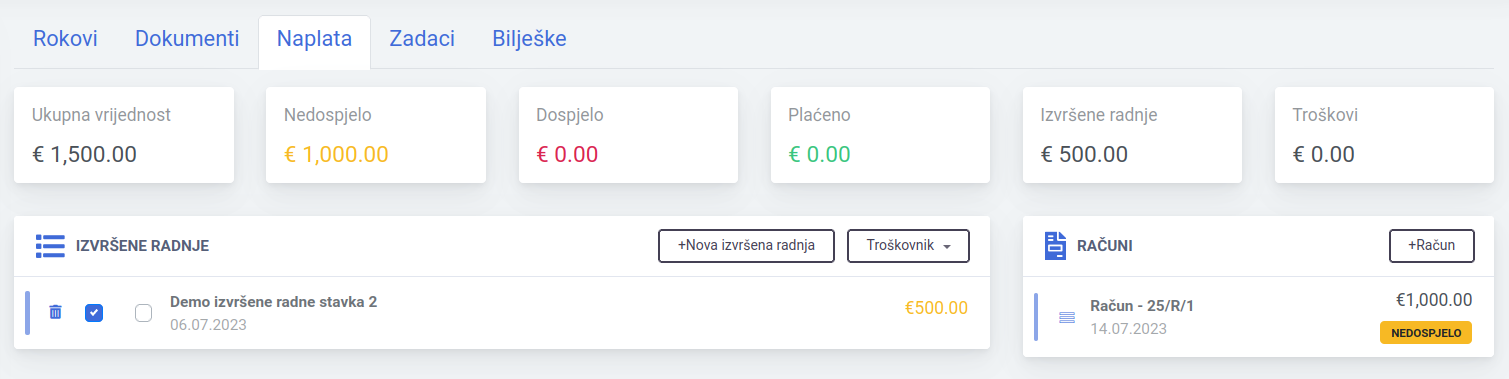 - Izvršene radnje - izvršene radne iz svih spisa koji nisu još ni na jednom računu