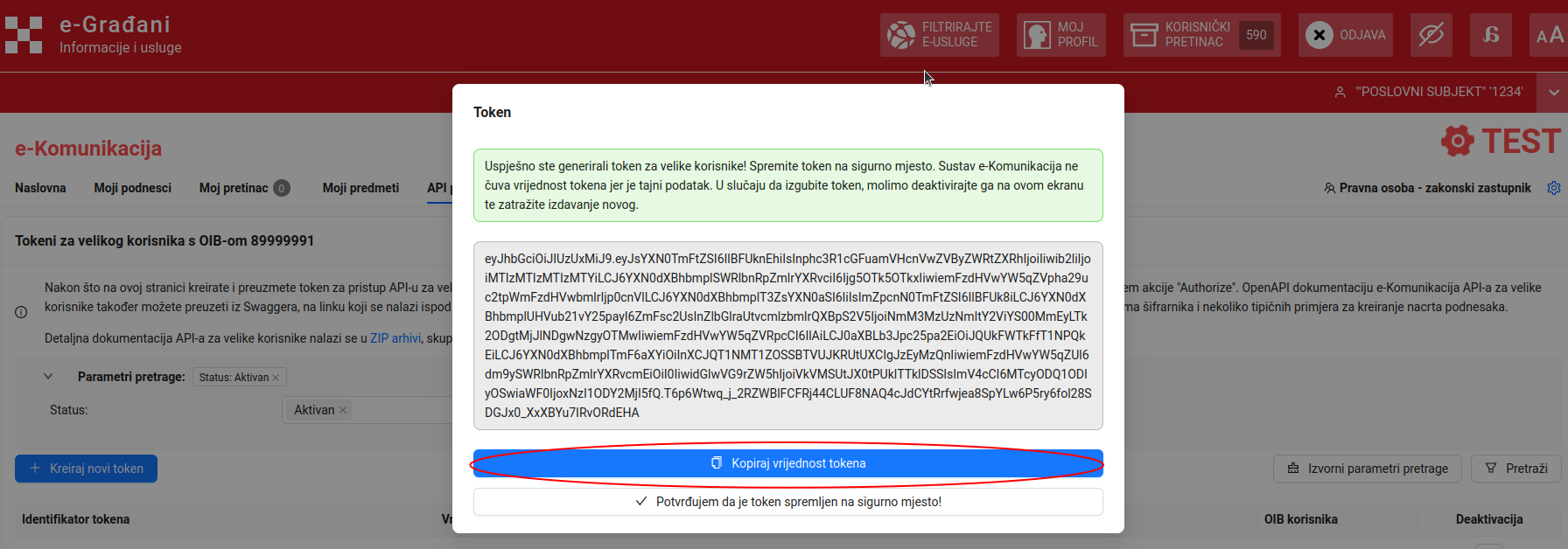 Kliknite na plavi gumb kako biste spremili vrijednost tokena u međuspremnik te potvrdite kopiranje sa gumbom ispod plavoga kao na slici.