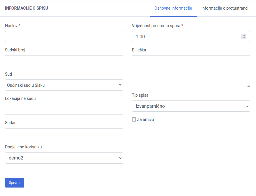 - Dodijeljen korisnik – spis je moguće dodijeliti jednom od korisnika u vašem uredu. Ako se opcija ne popuni spis će biti dodijeljen TODO vidi kome točno