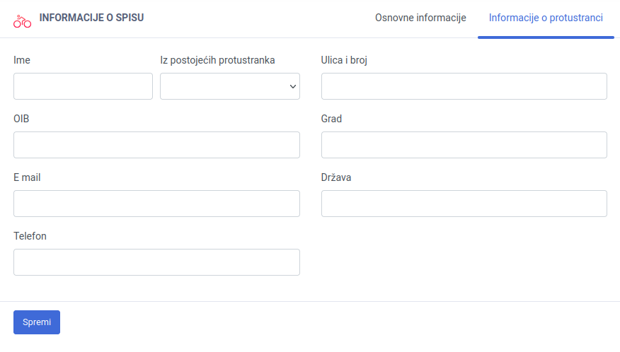 U gornjem desnom uglu postoji i tab "Informacije o protustranci" za unos informacija za protustranku na spisu.