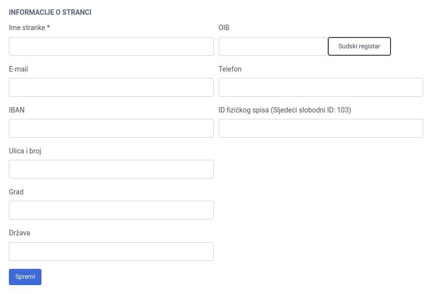 - OIB – OIB stranke koji mora odgovarati propisanoj strukturi OIB. Ako nije tako javiti e grešku da OIB nije ispravan. Gumb „Sudski registar“ ako se u polje OIB unese OIB pravne osobe koja je registrirano na trgovačkom sudu klikom na taj gumb s trgovačkog suda se povlače podaci o toj pravnoj osobi