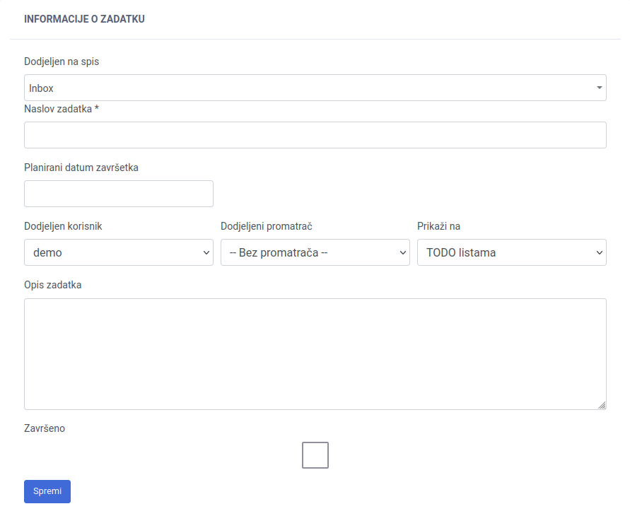 - Dodijeljen na spis - Ovo polje je padajući izbornik sa svim spisima. Izborom jednog od njih sa padajućeg izbornika zadatak koji kreiramo će biti dodijeljen na taj spis. Napomene: Jedan od izbora je i "spis" Inbox koji se preporučuje koristiti za zadatke koji prirodno ne spadaju na neki spis.