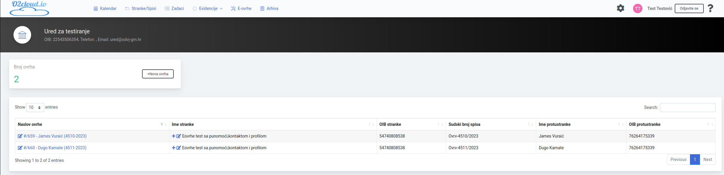 Spisak je moguće pretraživati vrlo slično kao i ostale spise. Na tom ekranu možemo dodati novu ovrhu klikom na "+Nova ovrha" ili možemo otvoriti postojeću ovrhu klikom na ime ovrhe.