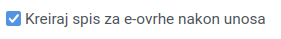 Ako želimo da ovrha koju smo upravo unijeli u sustav E-ovrha pomoću program o2cloud ostane zapamćene radi daljnje evidencije ovrha potrebno je kliknuti na checkbox opcije "Kreiraj spis za ovrhu nakon unosa" kao na slici: