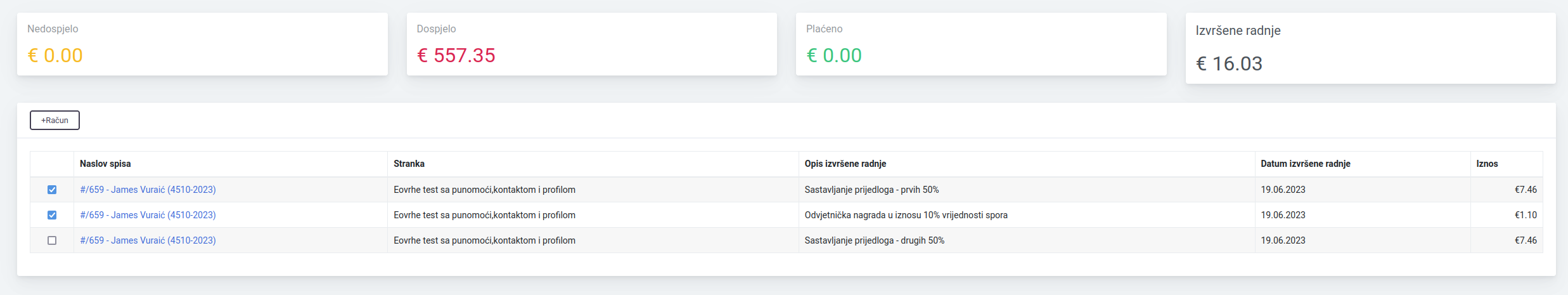 Kad se odaberu željene radnje klikom na gumb +Račun odabrane stavke će se prebaciti na novo kreirani račun. Taj račun će se vidjeti na spisku računa koji još nisu dospjeli i na svakom spisu/ovrsi koja ima barem jednu izvršenu radnju na tom računu.