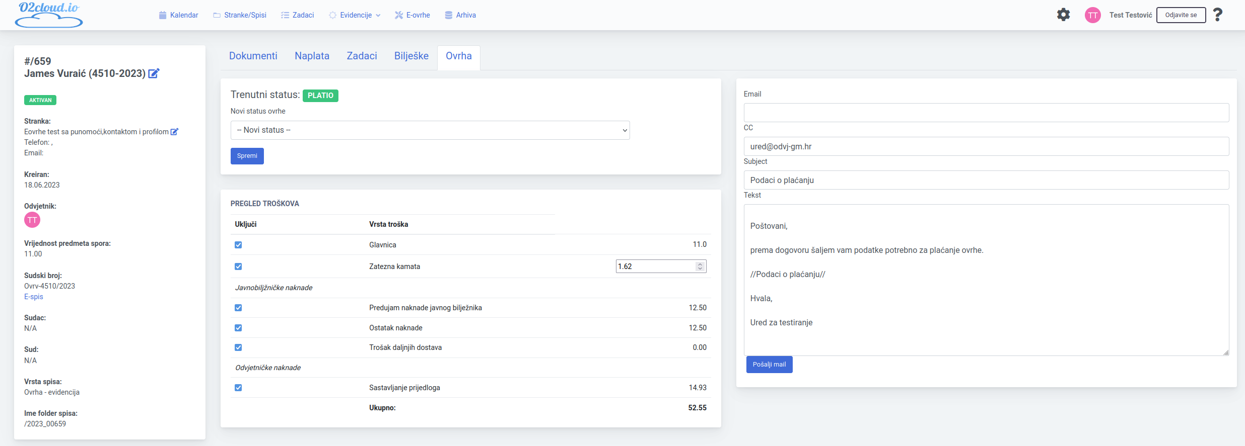 Na ovom tabu možemo promijeniti status ovrhe, poslati mail s informacijama o plaćanju ovrhe i regulirati što sve ulazi u iznos ovrhe.