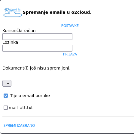 Ispod toga su izlistane opcije "Tijelo email poruke" i prilozi koje mail koji ste otvorili ima. Uz svaki tu opciju je checkbox koji možete označiti ako želite da se tekst maila ili neki prilog spremi u o2cloud.